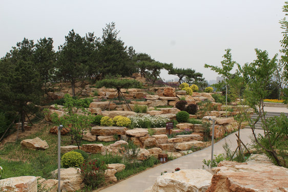 龍山位于中軸線廣場北側,占地面積384畝,栽植喬灌木1.75萬株,地被15萬平方米。包括六大景觀:龍源、花溪、花谷、巖石園、花海和起龍閣。龍源,占地面積15畝,位于主峰頂部,以傳統園林堆石手法,結合龍文化圖騰石刻,表現龍源圣境;花溪,通過山體高差的處理,營造山間水溪效果,為整個山體增加動態景觀;花谷,展示唐山當地鄉土植物,木本開花植物的應用,模擬北方自然山體植物景觀;巖石園,以大量巖生植物與景石相結合,形成巖生植物景觀,發揮科普教育作用;花海,位于山體西側的世園會主軸線,通過大量觀賞花卉和地形起伏變化增加主軸線震撼的視覺效果;起龍閣,位于山頂,建筑三層仿唐代風格造型,高30.3米,以元代畫家王振鵬所作“寶津之樓”為藍本。