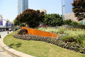 聯合項目團隊在區綠化和市容管理局的統一部署下,在本階段工作中圍繞著六百商場門口4塊綠地的耐候鋼板制作、橋頭堡綠地的升級改造、大三角綠地的植物配置、移動樹桶苗晚櫻布置展開一系列景觀提升工作,項目預計2019年7月全部完成。