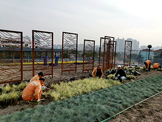文體中心屋頂花園改造前的綠地因長期缺少有效的養(yǎng)護,荒廢已久。此次改造目的旨在為校園內(nèi)的師生提供一個可供游玩休閑的花園。整個屋頂花園的亮點是將耐候鋼板作為擋土墻和使用耐候鋼板制作的屏風。在植物配置上,考慮到屋頂花園的屋頂荷載能力有限、覆土較淺。選擇了以多種觀賞草和多年生花卉的搭配。在大斜坡一側(cè),排水和采光較好,使用了芝櫻、紫嬌花附以草坪的形式。其中兩個區(qū)域采用創(chuàng)新性的籽播海濱菊和種球郁金香的種植方式。拾級而上,會看見兩片墨西哥羽毛草區(qū)域,配合地塊的形式打造熱帶巖石園的風情。到達屋頂后,可以俯瞰整個校園的美景。屋頂上植物種植以芒草類為主,并在中心區(qū)域種植了網(wǎng)紅粉黛亂子草,在秋季大片的粉紅色也一定會吸引女生駐足拍照。再向里走可以看見耐候鋼板制作的屏風,在其之下有藍羊茅、金葉石菖蒲和八寶景天的植物搭配模式。